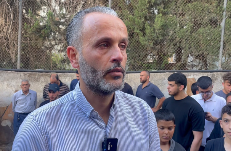 والد الطفل الشهيد محمد التميمي في أثناء تشييعه بعد استشهاده برصاص الاحتلال في رام الله.