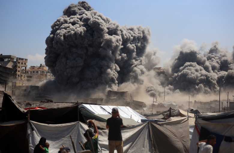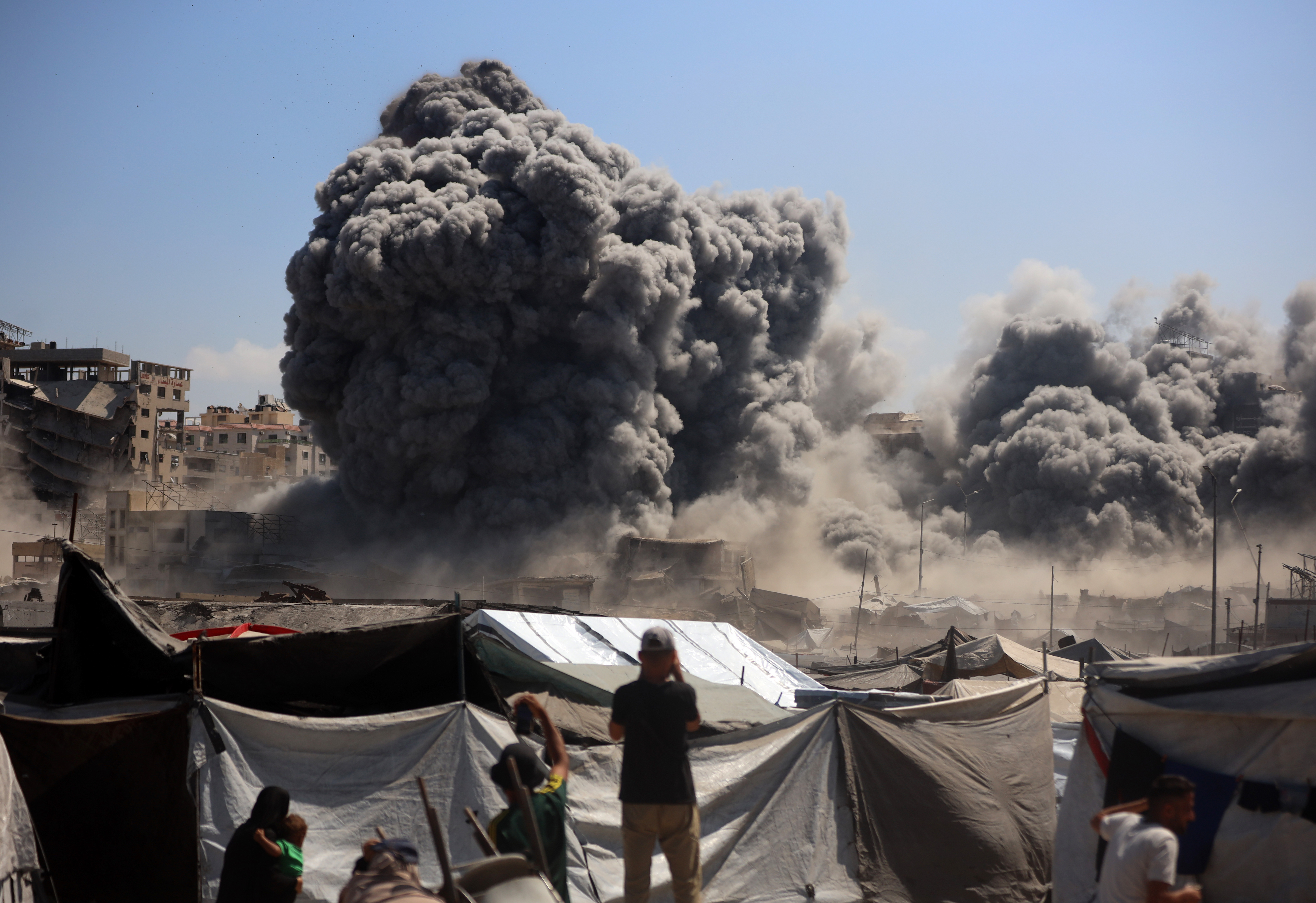 يتصاعد الدخان قرب خيم تؤوي نازحين فلسطينيين بعد أن دمّر قصف إسرائيلي مبنى يُدعى "برج باب البحر" في منطقة الرمال بمدينة غزّة، بتاريخ 10 أيلول/سبتمبر 2025. وكان جيش الاحتلال قد أعلن في 9 أيلول أنّه سيتحرّك بـ"قوة كبيرة" في مدينة غزّة، ودعا السكان إلى المغادرة مع تصعيده للهجوم الدموي على أكبر مركز حضري في القطاع