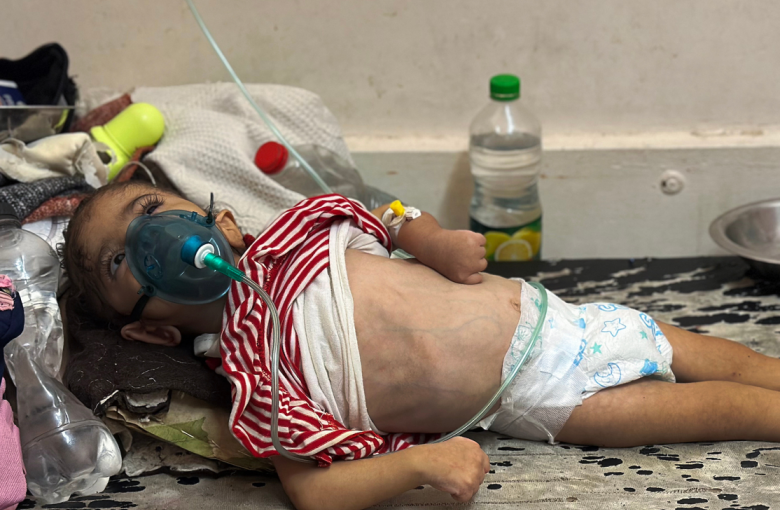 أطفال يتلقون الرعاية الطبية في مستشفى ناصر بمدينة خانيونس، جراء إصابتهم بالأمراض الجلدية وسوء التغذية نتيجة منع الاحتلال الإسرائيلي دخول المساعدات الإنسانية والمستلزمات الطبية إلى قطاع غزة.