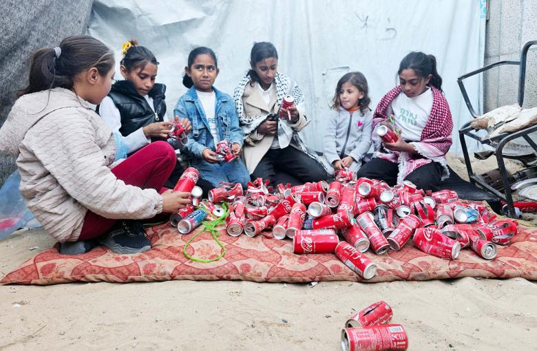 أطفال فلسطينيون نازحون يزينون الخيام والملاجئ المؤقتة باستخدام علب المشروبات الغازية الفارغة في منطقة المواصي غرب خان يونس جنوب قطاع غزة. بينما يستعدون للترحيب بشهر رمضان المبارك، وسط الحرب المستمرة والحصار والقيود الصارمة.