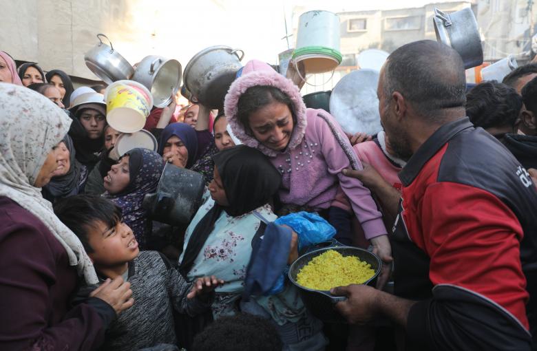 عائلات فلسطينية نازحة تتجمع لتلقي وجبات مجانية من مطبخ خيري في مخيم النصيرات للاجئين. وقد أدى تعليق عمليات العديد من المنظمات الإنسانية الدولية في قطاع غزة، بسبب القيود الإسرائيلية وانخفاض دخول المساعدات، إلى تفاقم معاناة السكان وتعميق الأزمة الغذائية داخل المخيمات.