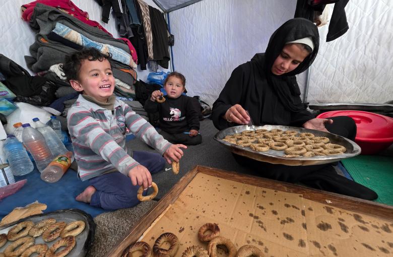 يقوم الفلسطينيون، بينهم نساء وأطفال، بإعداد كعكات عيد الفطر التقليدية داخل خيمة مؤقتة وسط نقص الوقود وإغلاق المعابر الحدودية