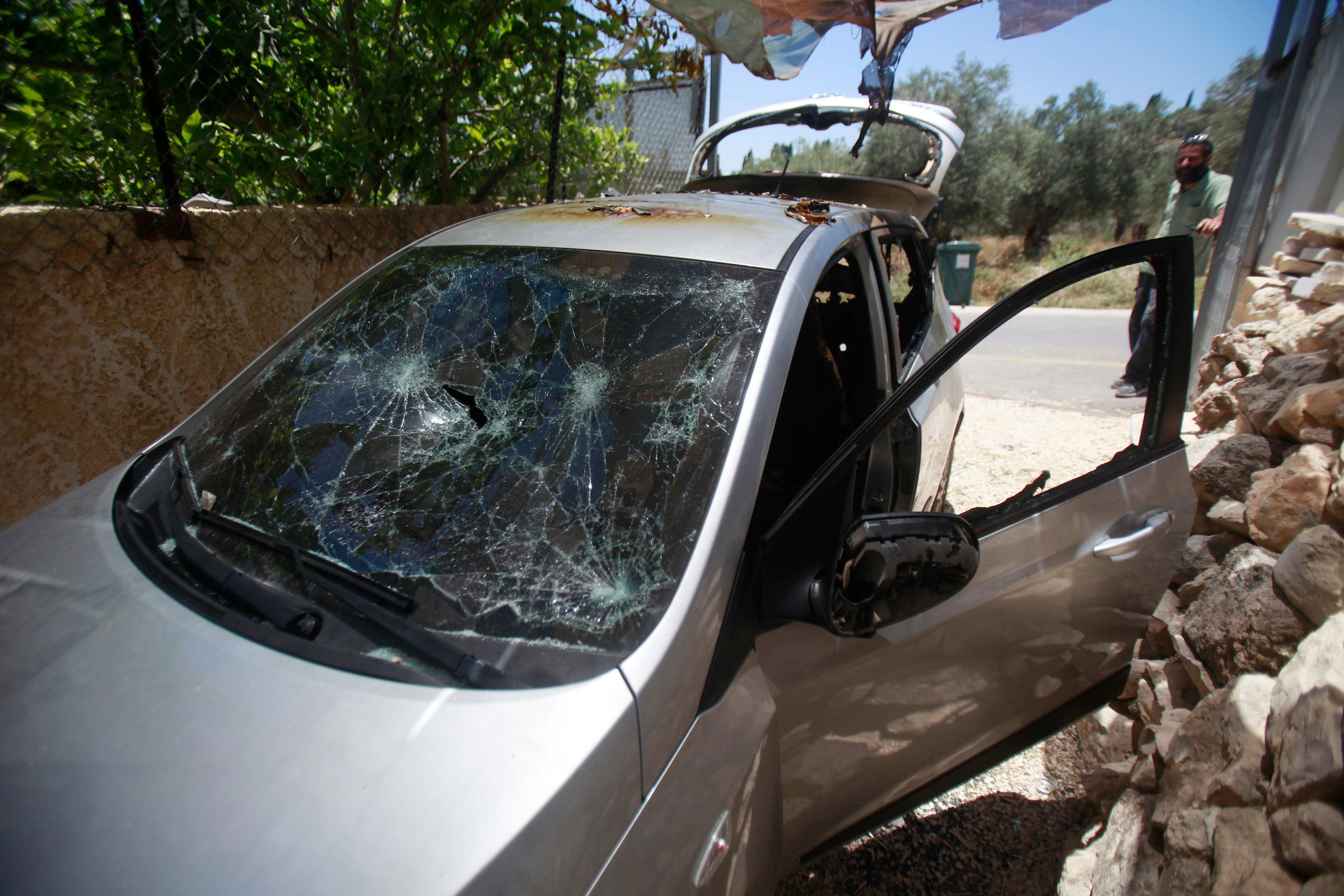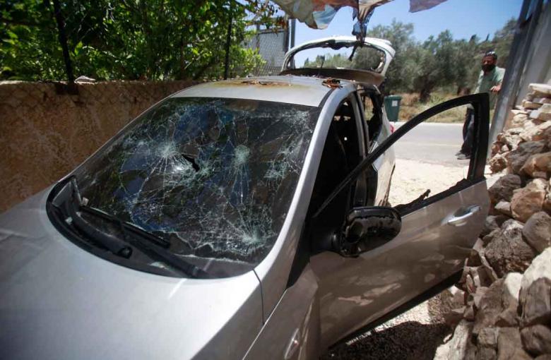 فلسطينيون يعاينون مركباتهم التي أحرقها المستوطنون بحماية قوات جيش الاحتلال في نابلس الضفة الغربية.