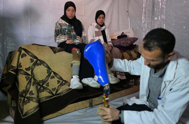 ولدت فتاتان، لميس وريماس شلوف، بتشوهات خلقية بعد أن استنشق والدهما غاز الفوسفور بالقرب من منزلهما في رفح. تم بتر ساقي لاميس، وتم بتر ساق واحدة لريماس بعد عامين. ومع تلف أطرافهم الاصطناعية وإغلاق المعابر، يترددون على مركز مؤقت في منطقة مواسي في خان يونس، بحثًا عن التنقل وفرصة للحياة. ويقدم لهم هذا المركز وعشرات غيرهم خدمات إعادة التأهيل وصيانة الأطراف، في وقت يعاني فيه آلاف الفلسطينيين من بتر أطرافهم نتيجة حرب الاحتلال المستمرة منذ أكثر من عامين، وسط قيود تمنع العلاج ودخول مواد إعادة التأهيل اللازمة.