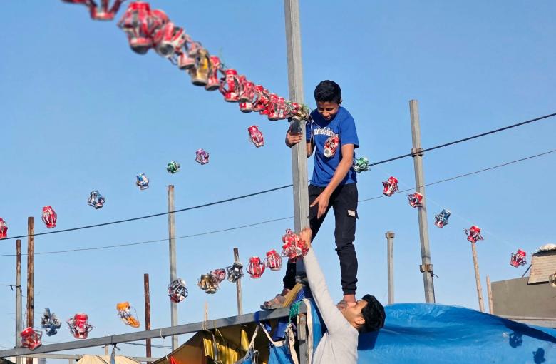 أطفال فلسطينيون نازحون يزينون الخيام والملاجئ المؤقتة باستخدام علب المشروبات الغازية الفارغة في منطقة المواصي غرب خان يونس جنوب قطاع غزة. بينما يستعدون للترحيب بشهر رمضان المبارك، وسط الحرب المستمرة والحصار والقيود الصارمة.