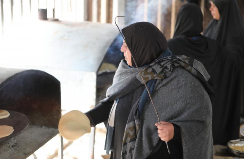تعمل مجموعة من النساء داخل مخبز أنشئ في مخيم اليرموك للاجئين بمدينة غزة ضمن مبادرة إنسانية بالشراكة مع اللجنة الدولية للصليب الأحمر. وتهدف المبادرة إلى تخفيف الأعباء المعيشية للنساء النازحات، خاصة خلال شهر رمضان.