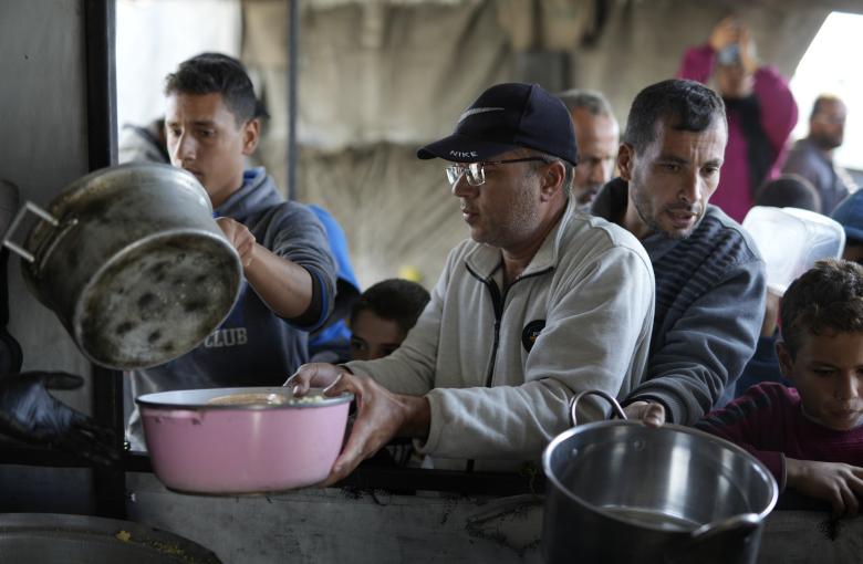 يتجمع النازحون الفلسطينيون لتلقي وجبات الطعام من مطبخ خيري خلال شهر رمضان في مدينة غزة. ويعيش الفلسطينيون في الخيام والملاجئ وسط ظروف معيشية مزرية بسبب الحرب وفقدان الضروريات الأساسية. وفي الوقت نفسه، تتعرض العديد من المنظمات الخيرية للتهديد بالإغلاق بسبب القيود الإسرائيلية المستمرة وندرة المساعدات المسموح بدخولها.