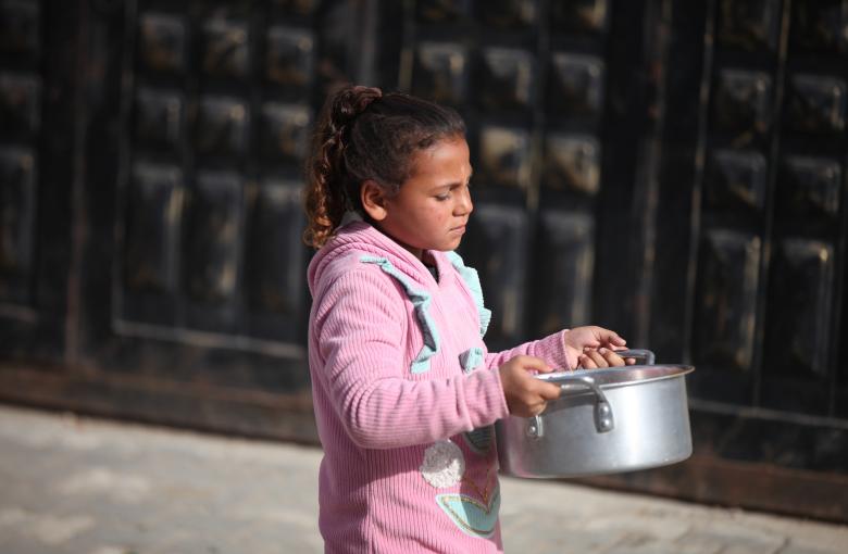 يتجمع النازحون الفلسطينيون لتلقي وجبات الطعام من مطبخ خيري خلال شهر رمضان في مخيم النصيرات للاجئين وسط قطاع غزة