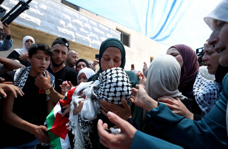 والدة الطفل محمد التميمي في أثناء تشعييه بعد اسنتشهاده برصاص الاحتلال في الضفة الغربية.