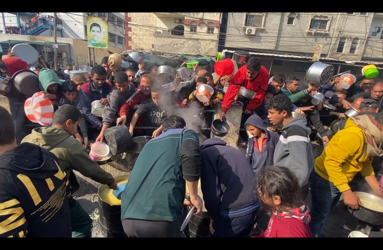 أهالي قطاع غزة النازحين إلى رفح جنوب القطاع، ينتظرون أدوارهم لأخذ الطعام بعد معاناتهم بنقصٍ حاد بالمواد الغذائية.