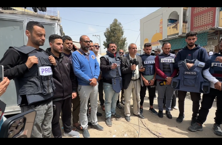 خانيونس/فيديو صحفيون يتجمعون أمام مستشفى ناصر في خان يونس احتجاجا على استهداف زميليهما حلمي الفقاوي ويوسف الخازندار اللذين قتلا في هجمات احتلال على غزة
