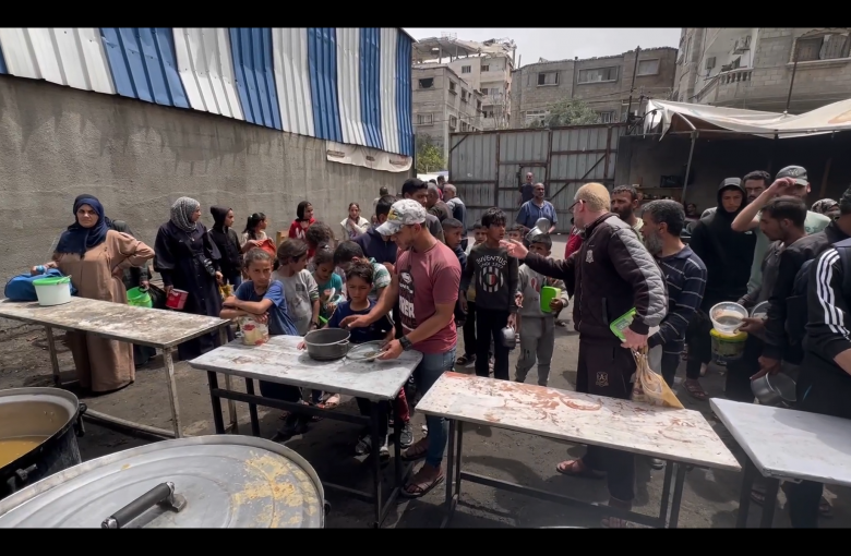 النصيرات/فيديو يتجمع الفلسطينيون بأعداد كبيرة لتلقي الوجبات التي توزعها الجمعيات الخيرية في مخيم النصيرات للاجئين في وسط غزة