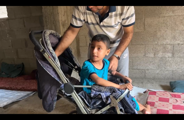 غزة/فيديو الطفل الفلسطيني عبيدة لبيد، 8 سنوات، من ذوي الاحتياجات الخاصة، يعتني به والده داخل منزل غير مكتمل