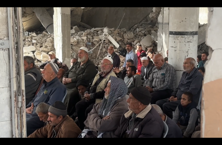 فلسطينيون يؤدون صلاة الجمعة وسط أنقاض مسجد صلاح الدين الذي دمرته هجمات الاحتلال في حي الزيتون جنوب مدينة غزة.