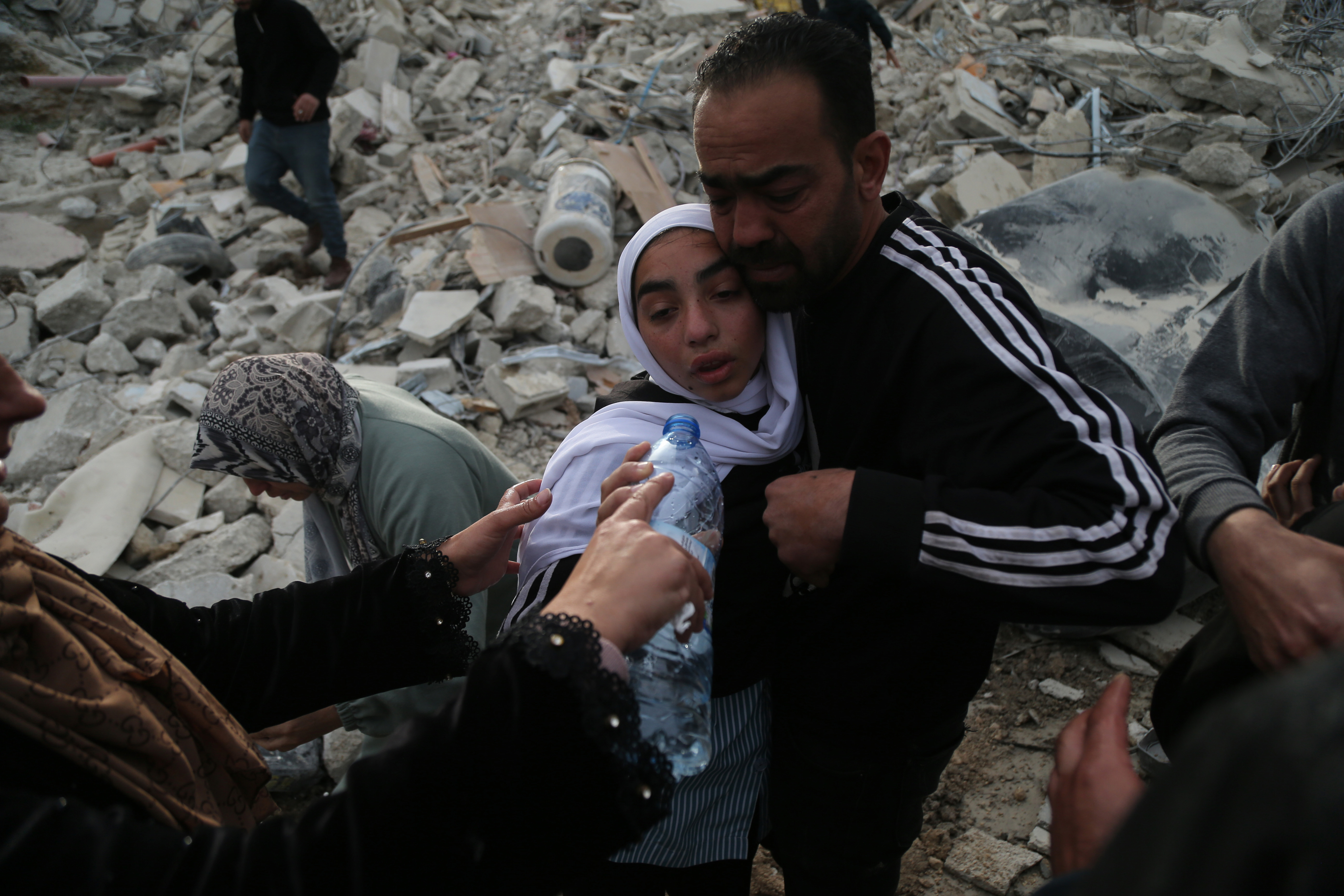 الفلسطينيون يتفاعلون مع قيام قوات الاحتلال بهدم منزل مملوك للفلسطينيين مكون من ثلاثة طوابق بسبب عدم وجود رخصة بناء، في بلدة ترقوميا شمال غرب الخليل بالضفة الغربية