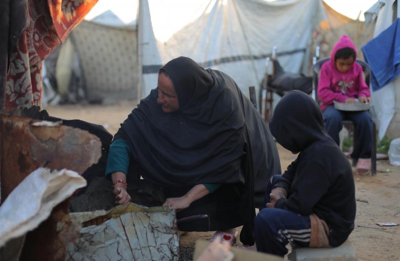 عائلة فلسطينية عمياء تستعد للإفطار خارج خيمتها في مخيم بوسط قطاع غزة خلال شهر رمضان. تعيش عائلة يوسف أيوب، النازحة من شمال قطاع غزة، في ظروف إنسانية مزرية. يوسف، 45 عاماً، وزوجته إيمان، 43 عاماً، كلاهما أعمى ويكافحان يومياً لتغطية نفقاتهما، بما في ذلك إعداد وجبات الطعام قبل الفجر وبعد غروب الشمس، وسط الحرب والنزوح المستمرين.