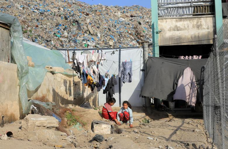 ويعيش النازحون الفلسطينيون في خيام متداعية بالقرب من مكب نفايات في مدرسة تم تحويلها إلى ملجأ في مدينة غزة. وتتفاقم الأوضاع الإنسانية القاسية بسبب انتشار الحشرات والقوارض والروائح الكريهة، مما يزيد المخاوف من تفشي الأمراض، خاصة بين الأطفال.