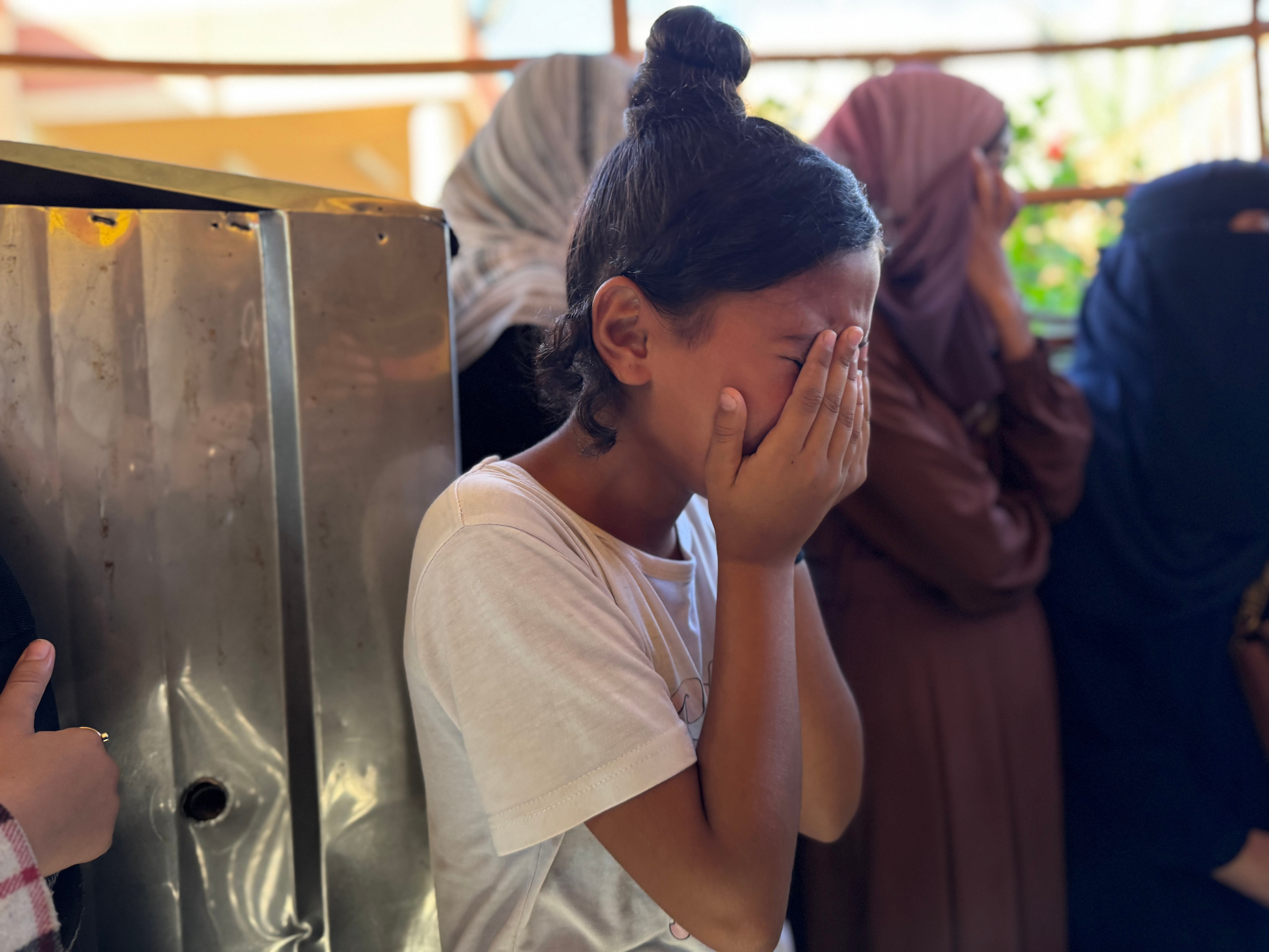 أقارب الفلسطينيين الذين استشهدوا في غارة جوية إسرائيلية ينعون أحباءهم في مشرحة مستشفى ناصر في خان يونس، غزة، بتاريخ 8 تموز/يوليو 2025. وبحسب التقارير، فإن الغارة استهدفت خيامًا كانت تأوي مدنيين نازحين في منطقة المواصي، ما أسفر عن سقوط العديد من الشهداء والجرحى.