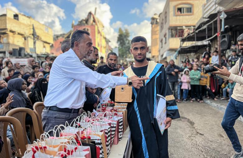 فلسطينيون يشاركون في حفل تكريم طلاب المدارس الثانوية الذين فقدوا والديهم خلال الحرب، والذي أقيم في مخيم النصيرات بوسط قطاع غزة. وتضمن الحدث، الذي نظمه فريق إغاثة محلي، أنشطة ودعمًا عاطفيًا للطلاب. وتتضمن اللقطات مقابلات مع عدد من الطلاب يتحدثون فيها عن رحلتهم التعليمية والظروف الصعبة التي يواجهونها بعد فقدان عائلاتهم. مخيم النصيرات، وسط قطاع غزة.