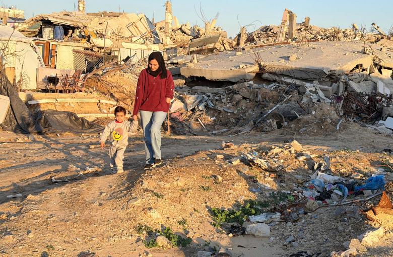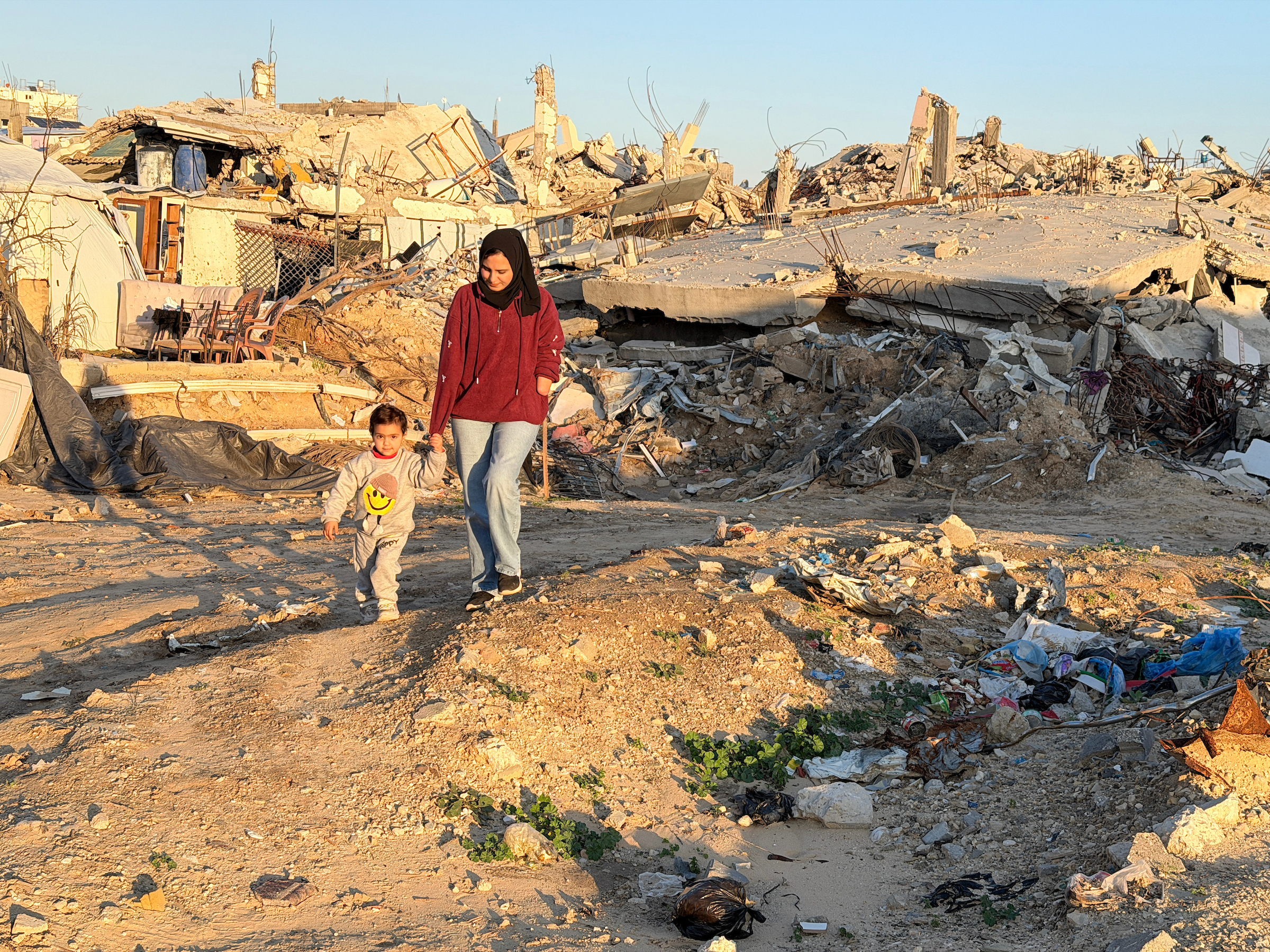 تعيش الفلسطينية نيبال الحاسي، 25 عاماً، التي فقدت ذراعيها بعد إصابتها بقذيفة مدفعية أثناء فرارها من شمال غزة إلى وسط القطاع، مع ابنتها البالغة من العمر عامين في خيمة أقيمت بجانب أنقاض منزلها المدمر في جباليا بالقرب من المنطقة العازلة شمال قطاع غزة