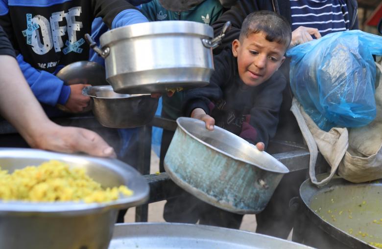يتجمع النازحون الفلسطينيون لتناول وجبة الإفطار الرمضانية في مطبخ خيري بمخيم النصيرات للاجئين وسط قطاع غزة
