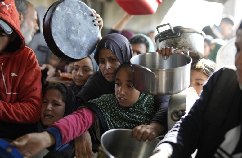 يتجمع النازحون الفلسطينيون لتلقي وجبات الطعام من مطبخ خيري خلال شهر رمضان في مدينة غزة. ويعيش الفلسطينيون في الخيام والملاجئ وسط ظروف معيشية مزرية بسبب الحرب وفقدان الضروريات الأساسية. وفي الوقت نفسه، تتعرض العديد من المنظمات الخيرية للتهديد بالإغلاق بسبب القيود الإسرائيلية المستمرة وندرة المساعدات المسموح بدخولها.