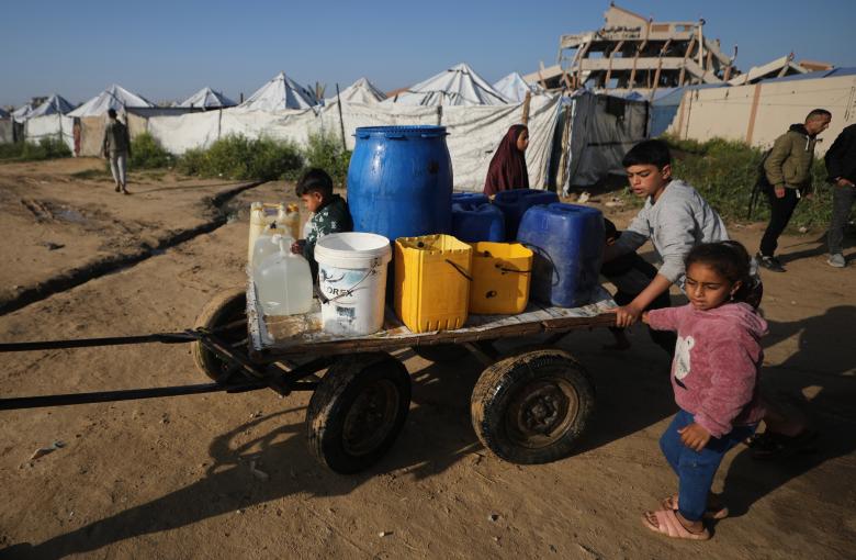 ويتجمع النازحون الفلسطينيون لجمع المياه وسط الخيام المتهالكة، مما يعكس تدهور الظروف المعيشية والنقص الحاد في الضروريات الأساسية. ويسلط هذا الضوء على الأزمة الإنسانية المستمرة التي يواجهها السكان بعد سنوات من الصراع. مخيم النصيرات للاجئين وسط قطاع غزة